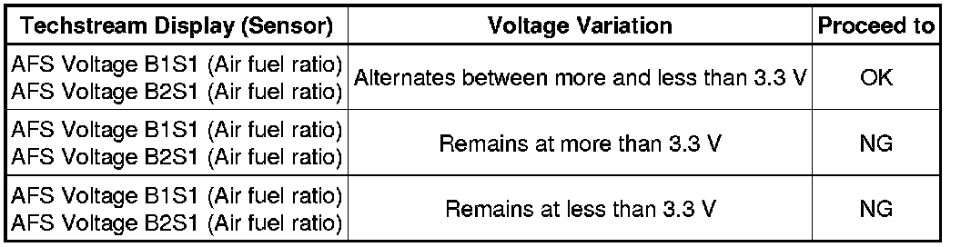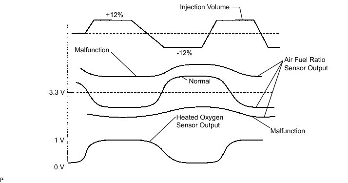 A normal heated oxygen sensor voltage (O2S B1S2 or O2S B2S2) reacts in accordance with increases and decreases in fuel injection volumes. When the air fuel ratio sensor voltage remains at either less or more than 3.3 V despite the heated oxygen sensor indicating a normal reaction, the air fuel ratio sensor is malfunctioning.