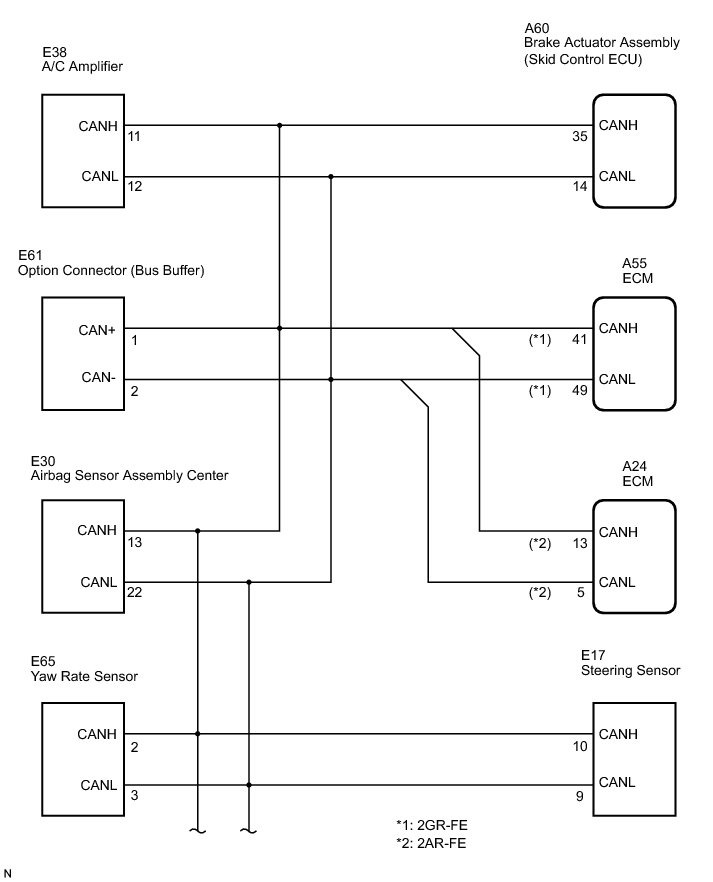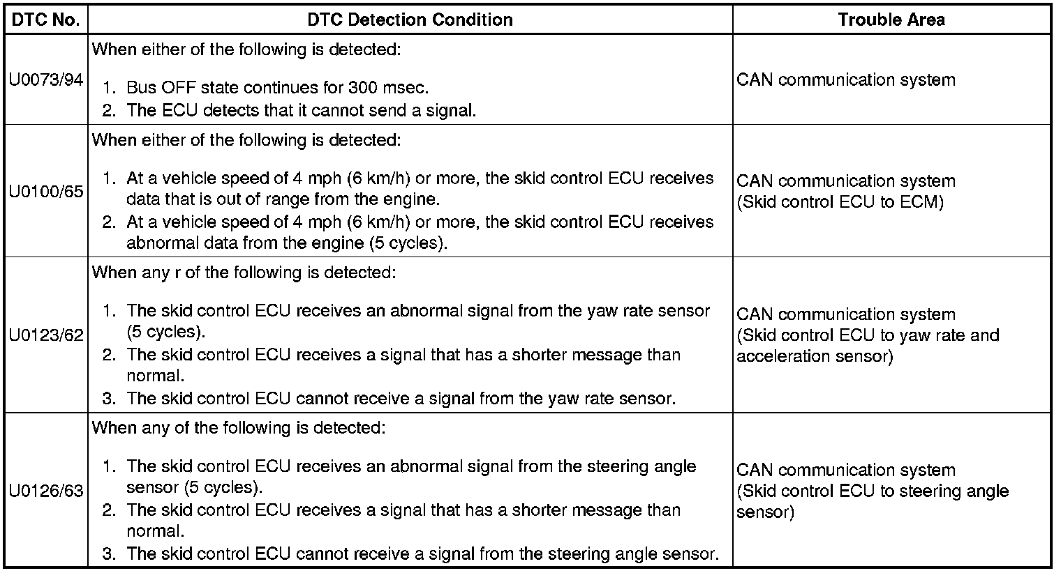 The skid control ECU receives the signals from the ECM, steering angle sensor, and yaw rate and acceleration sensor via the CAN communication system.
