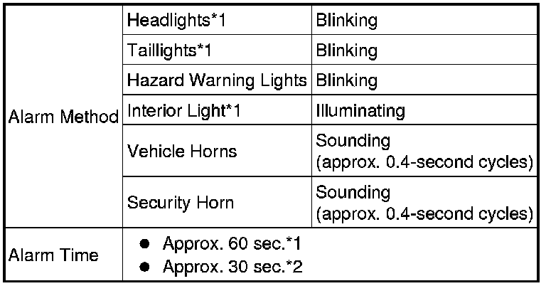 * The theft deterrent system switches to the alarm sounding state. Under this condition, the theft deterrent system is controlling the alarm rather than the panic alarm control. In order to cancel this alarm, refer to the theft deterrent system alarm sounding state cancellation procedure. (This condition is common both to active arming mode and to passive arming mode*1.)