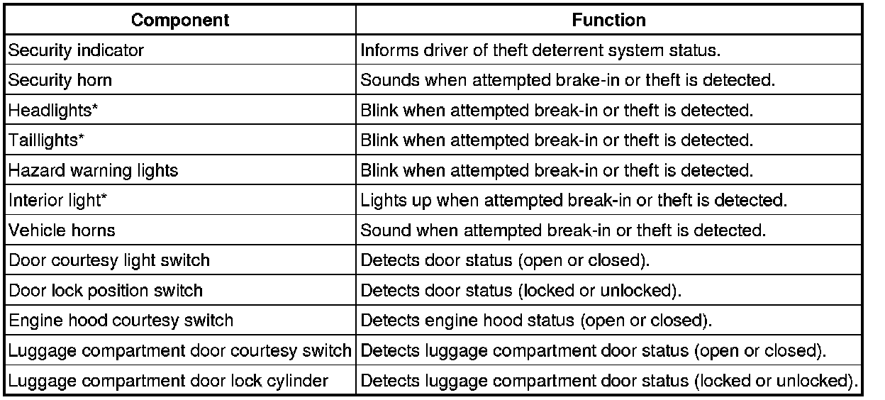* The theft deterrent system will operate when somebody attempts to forcibly enter the vehicle, unlock any door or luggage compartment door or open the engine hood or the luggage compartment door without using the key.
