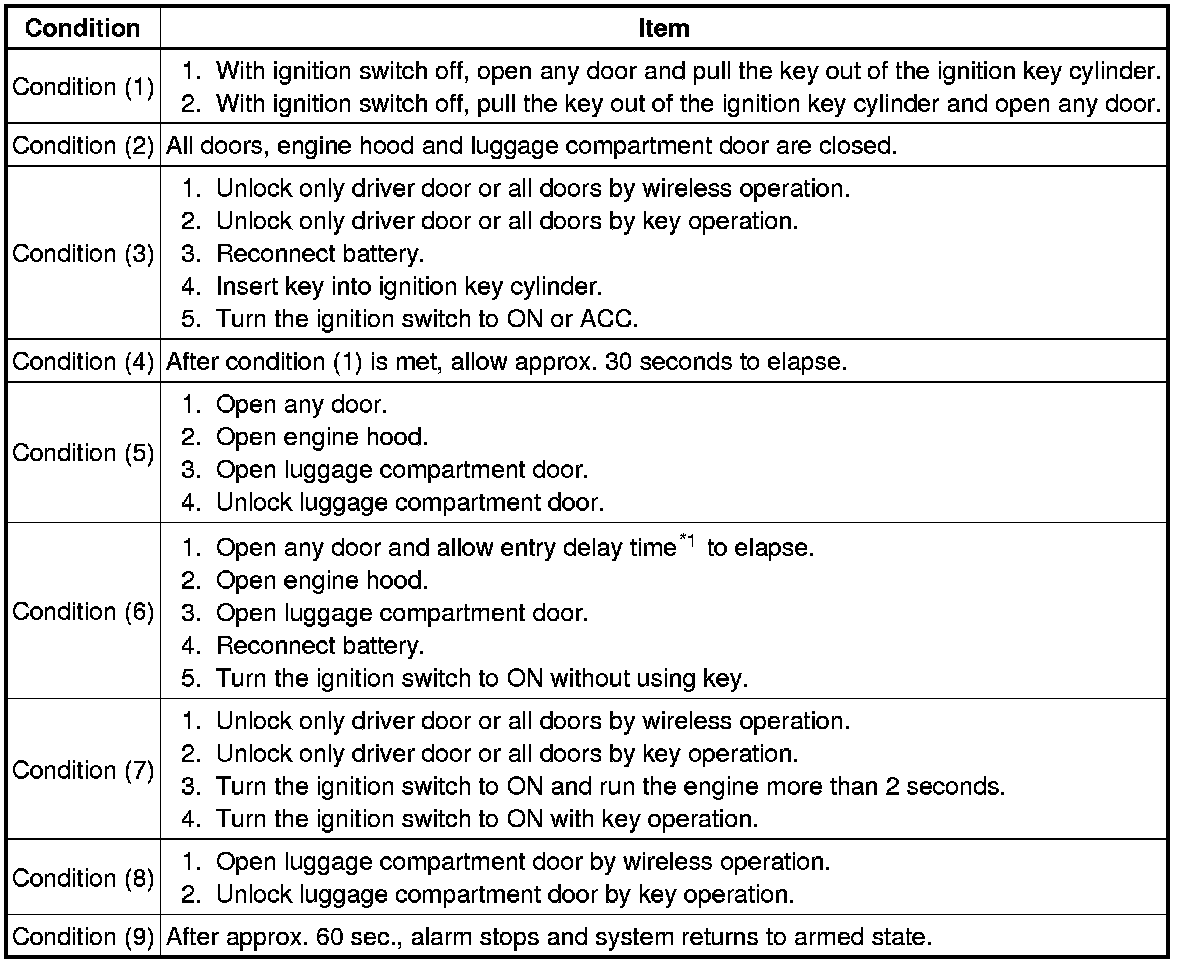*1: When any door is opened while all the doors are closed during passive arming mode, the entry delay time starts. If the switch condition (armed state -> disarmed state 1 or 2) is met during the entry delay time, the theft deterrent system will return to disarmed state 1 or 2. However, if the switch condition for disarmed state 1 or 2 is not met, the theft deterrent system will recognize it as a theft and set off the alarm. Entry delay time of 0, 14 or 30 sec. can be selected by the customizing function.