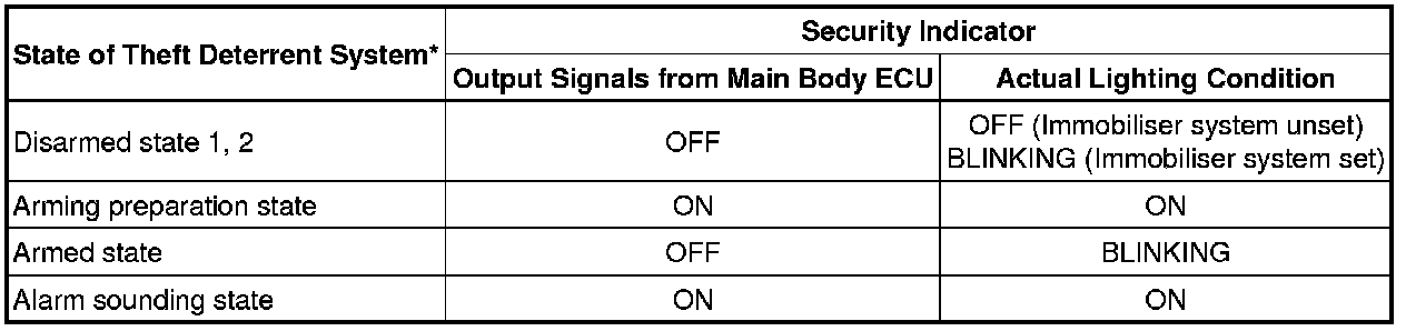 * When the immobiliser system is set, the security indicator blinks during both the disarmed state and the armed state, due to the output signals from the immobiliser system.