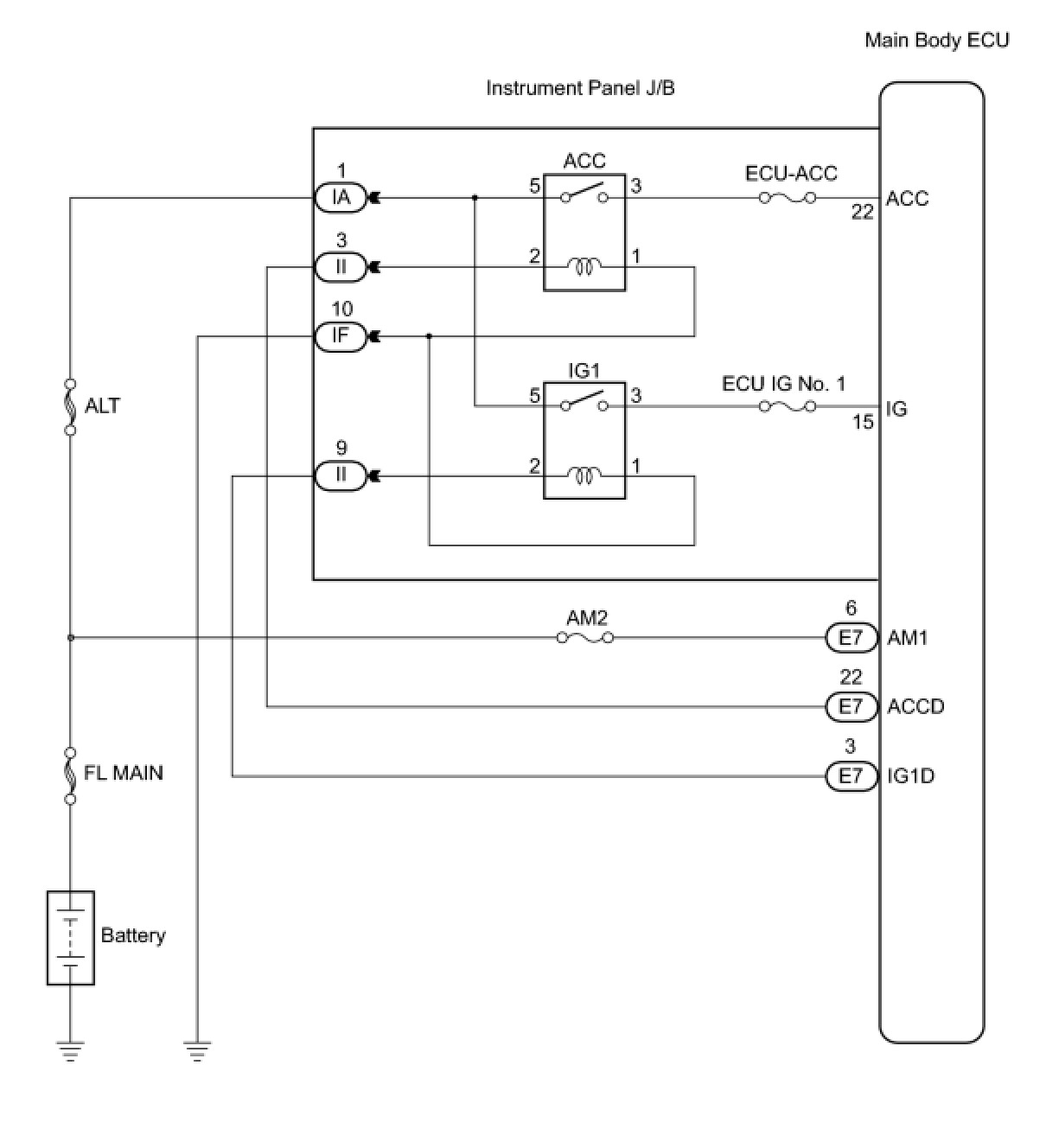 The main body ECU determines the ignition position (OFF, ACC, ON) based on signals from the IG or ACC circuit.