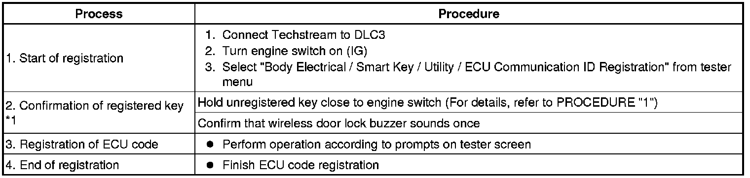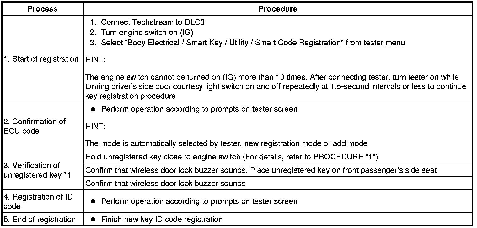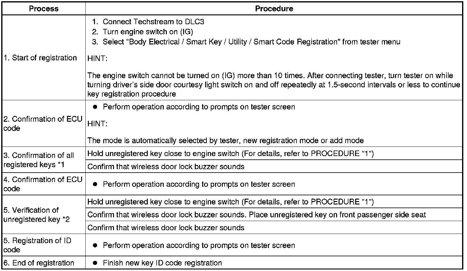 * *1: Perform this process for one of the keys registered for the vehicle. Finish the procedure within 30 seconds. If the procedure has not been finished within the specified time, perform registration procedures from process 1 again.
