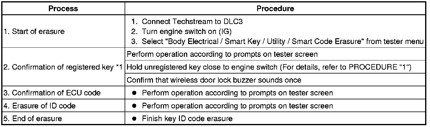 * *1: Perform this process for one of the keys registered for the vehicle. Finish the procedure within 30 seconds. If the procedure has not been finished within the specified time, perform erasure procedures from process 1 again.