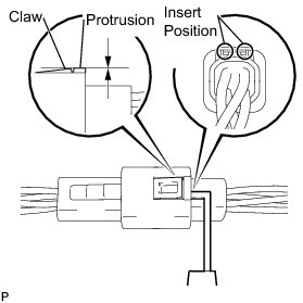 * Insert the gauge enough so that the claw becomes the same height as the protrusion of the connector housing. If the gauge is inserted too far, or if the notch on the claw is lifted directly using a screwdriver, the claw may be damaged.
