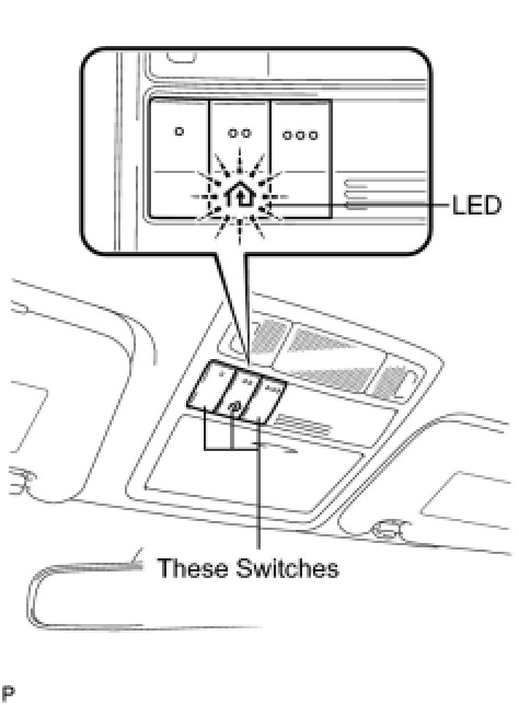 (1) Press and hold the left and right switches of the garage door opener system for 20 seconds. The LED will begin to flash approximately 5 times per second (5.6 Hz.) This indicates that the codes contained in the vehicle garage door opener system have been erased. Releasing the switches ends clear mode.