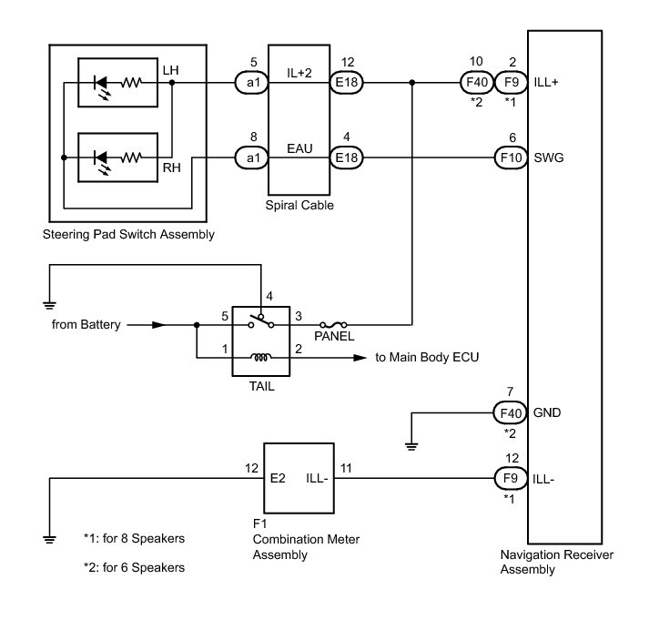 Power is supplied to the navigation receiver assembly and steering pad switch illumination when the light control switch is in the tail or head position.