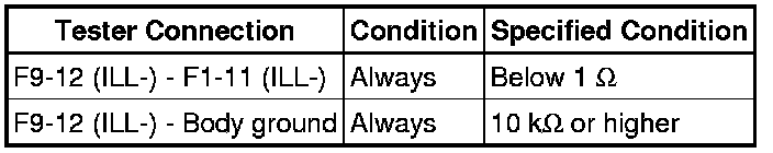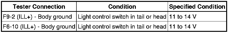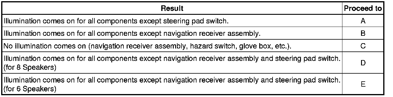 (a) Check if the illumination for the navigation receiver assembly, steering pad switch, glove box or others (hazard switch, transmission control switch, etc.) comes on when the light control switch is turned to the tail or head position.