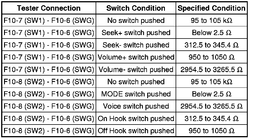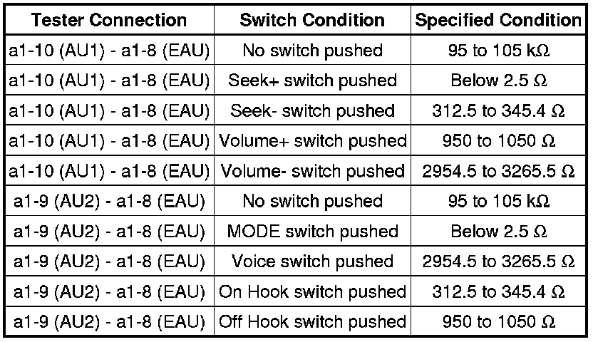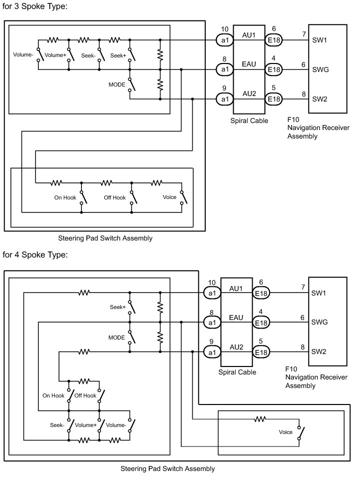 If there is a short in the circuit, the resulting condition is the same as to if the switch were continuously pressed. Therefore, the navigation receiver assembly cannot be operated using the steering pad switch, and the navigation receiver assembly itself cannot function.