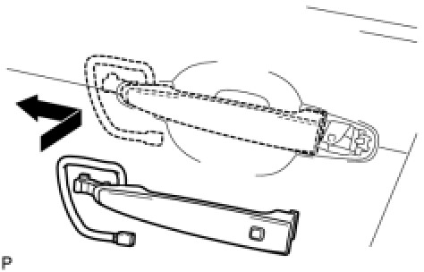 (b) Insert the rear end of the front door outside handle assembly into the front door outside handle frame. Slide the front door outside handle assembly to the front of the vehicle to install it.