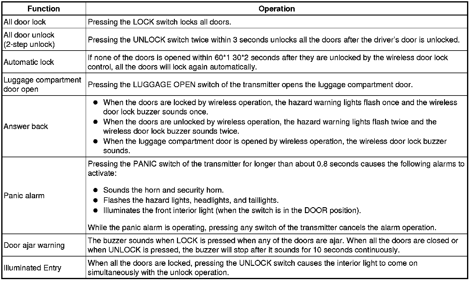 The wireless door lock control system functions to lock and unlock all the doors from a distance. The system is controlled by a hand-held transmitter which sends radio waves to the door control receiver. The certification ECU performs an ID code identification process and engages the door lock control.