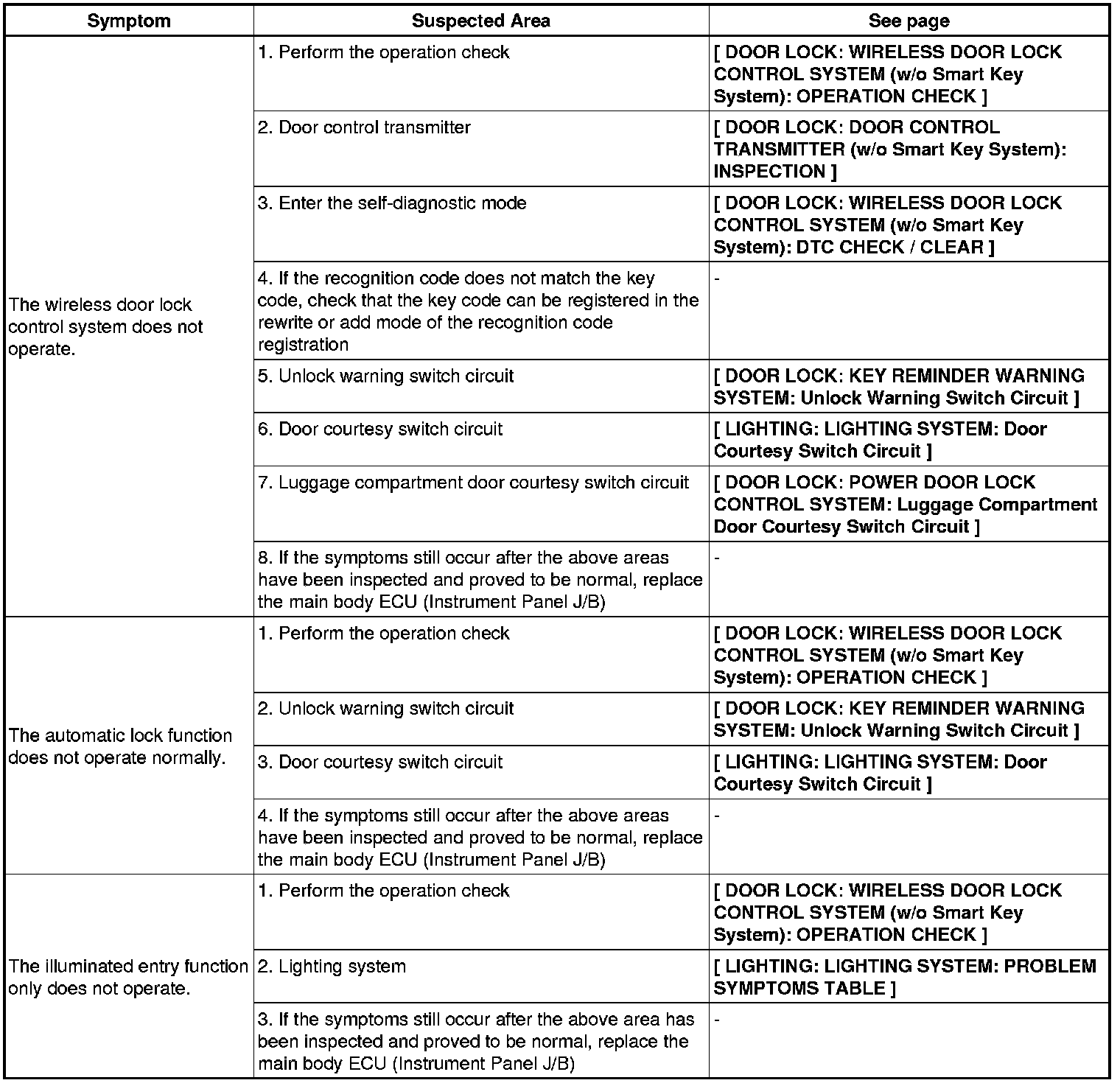 DOOR LOCK: WIRELESS DOOR LOCK CONTROL SYSTEM (w/o Smart Key System): PROBLEM SYMPTOMS TABLE