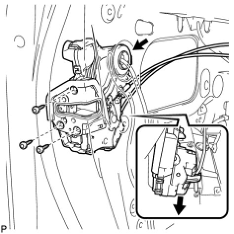 (c) Slide the front door lock assembly downward and pull out the front door lock open rod from the outside handle frame. Remove the front door lock assembly and cables as a unit.