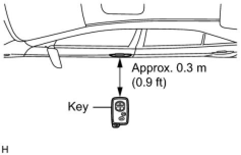 (2) Step 2: Inspect the entry lock operation's detection area and the indoor electrical key antenna for wave leaks. Hold the electrical key at a height of 1 m (3.3 ft) (0.1 m (0.3 ft) above the lower edge of the window frame). Pay attention to the direction and position of the electrical key in the illustration. When the electrical key is approximately 0.3 m (0.9 ft) from the vehicle and the lock switch is pressed, check that the all doors lock and the warning buzzer (for when the electrical key is forgotten) does not sound. If the warning buzzer sounds, the indoor electrical key antenna may have a wave leak.