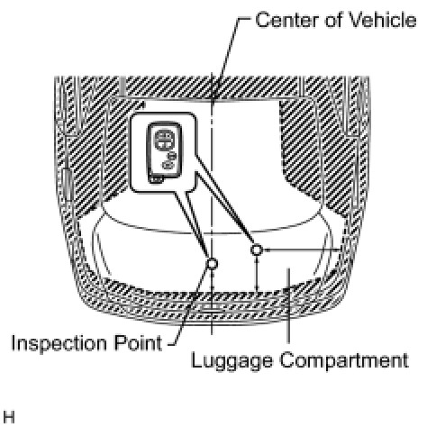 (2) Inspect the electrical key lock-in prevention's detection area. Pay attention to the direction of the electrical key shown in the illustration. When the electrical key is in either of the 2 inspection points in the illustration, check that: 1) closing the luggage compartment door sounds the electrical key's wireless buzzer, and 2) pressing the power luggage door open switch opens the luggage compartment door.