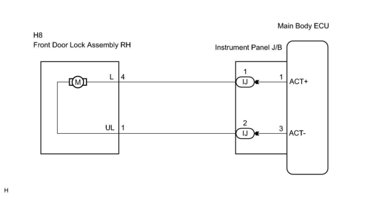 The main body ECU controls the front passenger door lock motor to lock/unlock the front passenger door. This ECU applies current from terminal ACT+ to terminal ACT- to operate the motor to lock the door. It reverses the direction of the current flow to operate the motor to unlock the door.