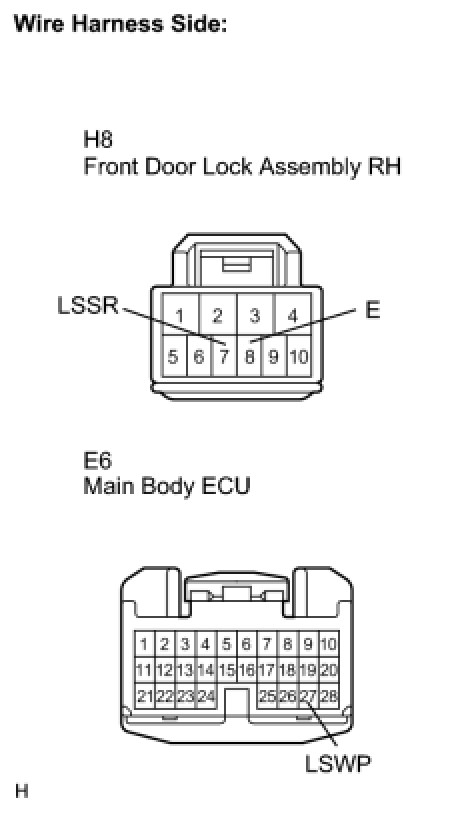 The main body ECU is connected to the front passenger door lock assembly via terminal LSWP and front passenger door lock/unlock state signals are input to the ECU.