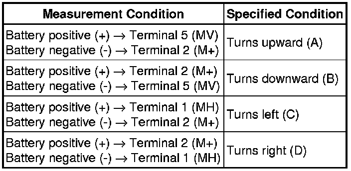 (1) Apply battery voltage and check operation of the mirror face, as shown in the table below.