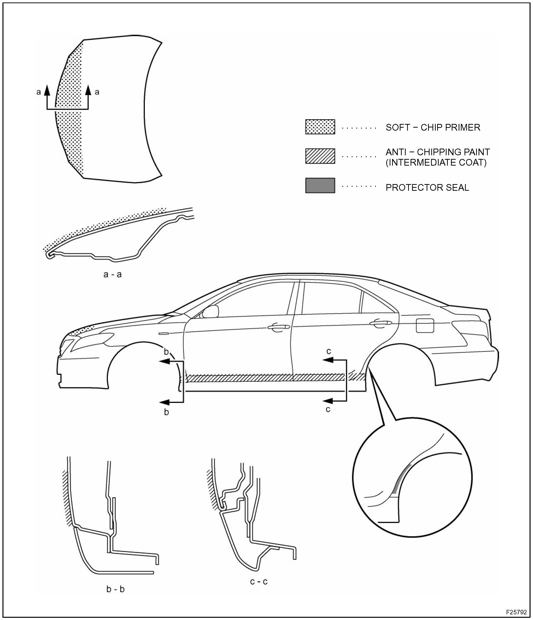 BODY PANEL ANTI-CHIPPING PAINT APPLICATION AREASTo protect the body from damage due to flying rocks, apply the anti-chipping paint to the rocker panels, wheel arches, and lower parts of the doors.