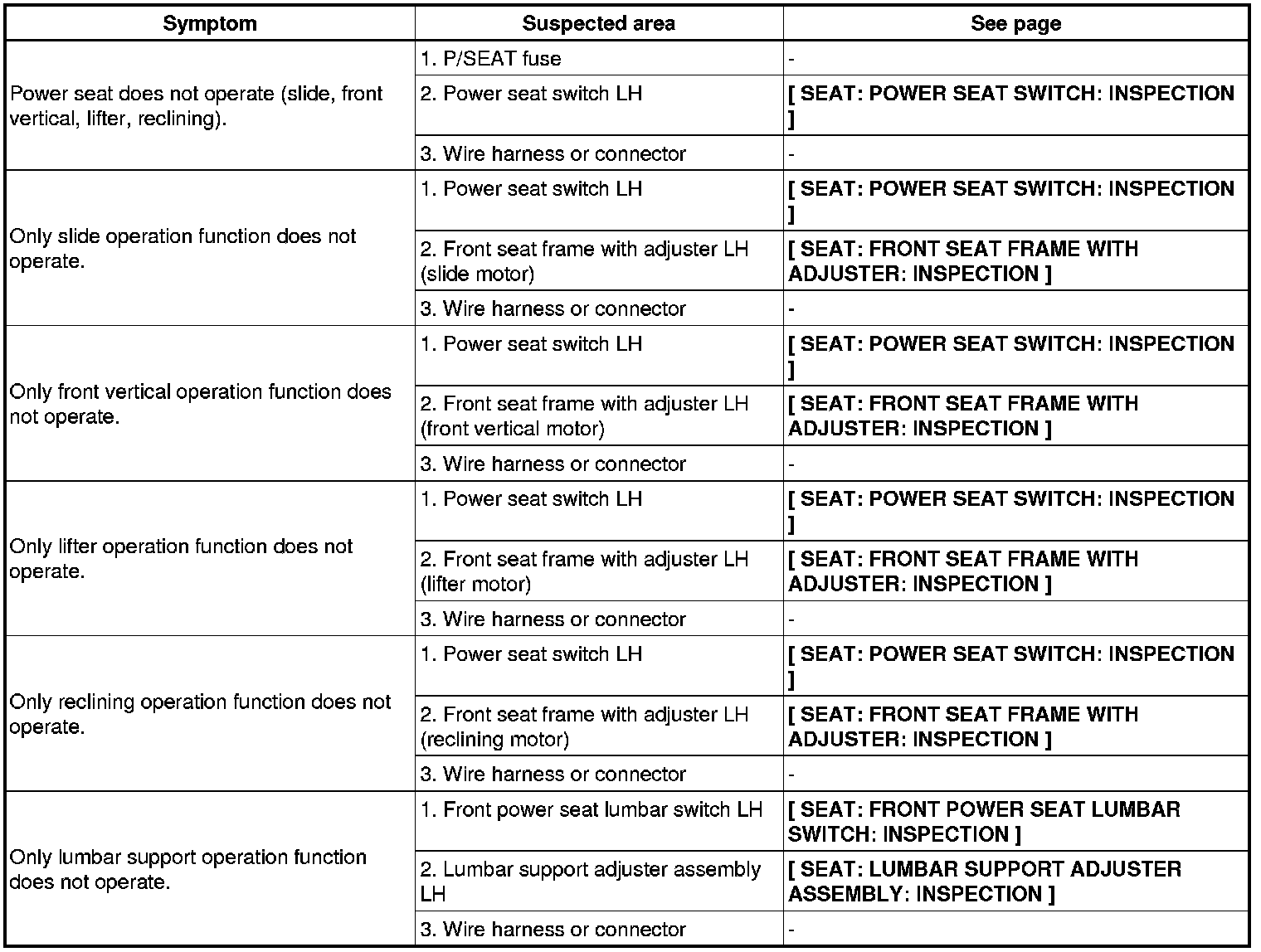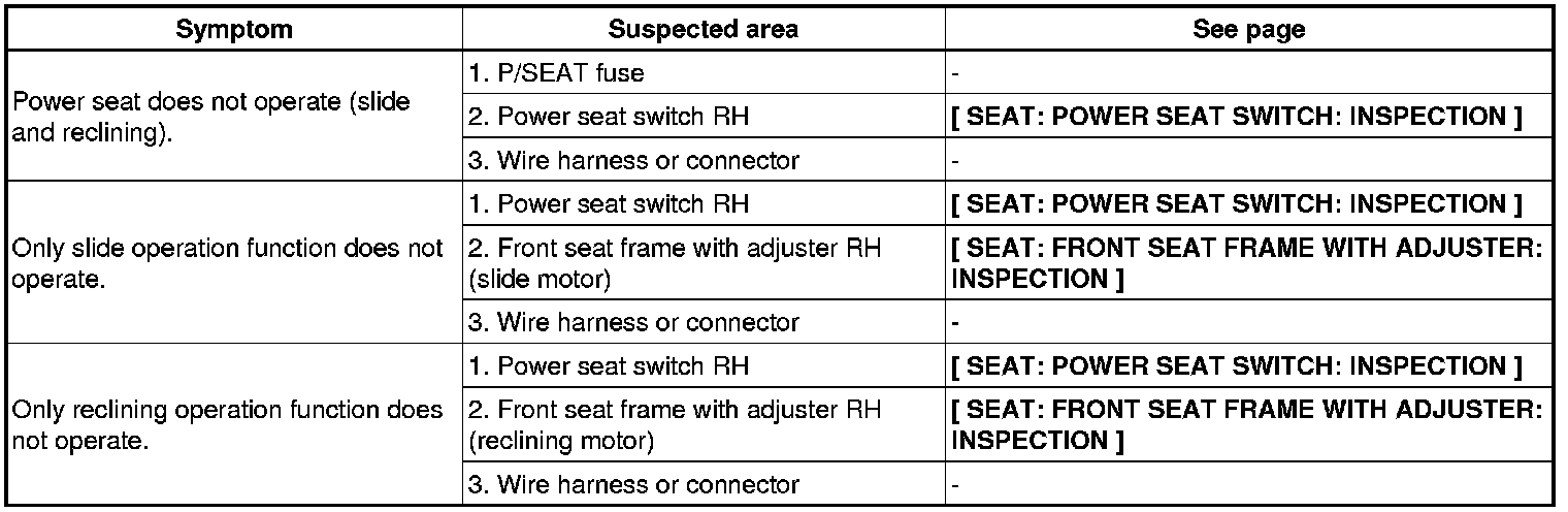 SEAT: FRONT POWER SEAT CONTROL SYSTEM: PROBLEM SYMPTOMS TABLE
