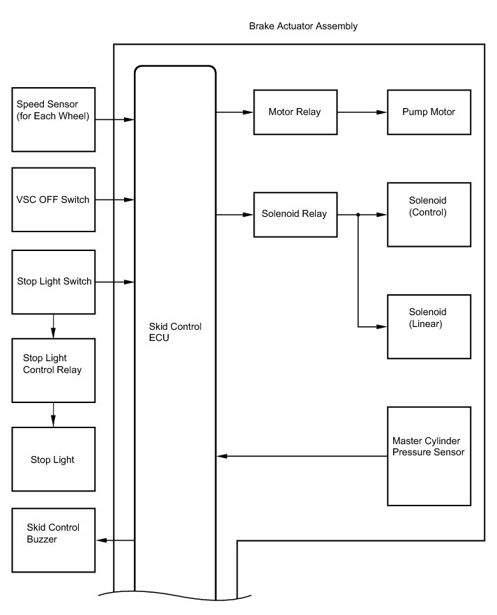 The skid control ECU receives the speed signal from each speed sensor and the hydraulic pressure signal from the master cylinder pressure sensor to determine whether brake assist is necessary. If brake assist is considered to be necessary, the skid control ECU sends control signals to the pump motor and solenoid valve.