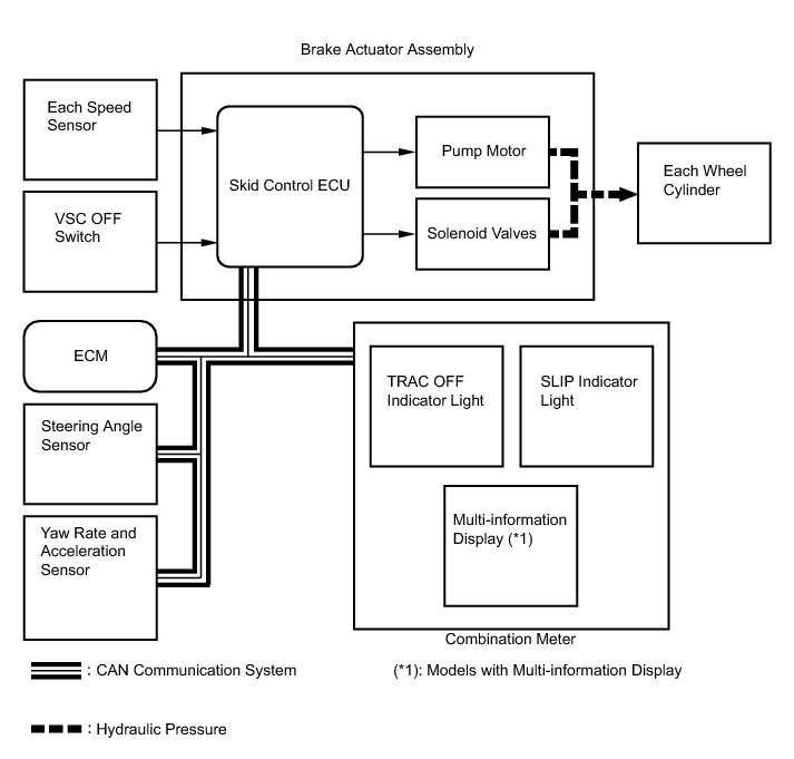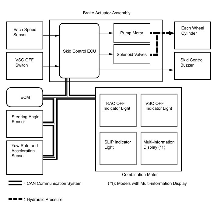 The skid control ECU determines the vehicle operating conditions based on signals received from the wheel speed sensors, yaw rate and acceleration sensor, and steering angle sensor. The skid control ECU sends signals via CAN communication to the ECM in order to control engine torque. The skid control ECU controls brake hydraulic pressure using the pump and solenoid valves.