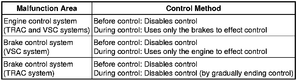 A malfunction in either the ABS or BA system will result in an identical operation, with ABS, BA, TRAC and VSC system control prohibited.