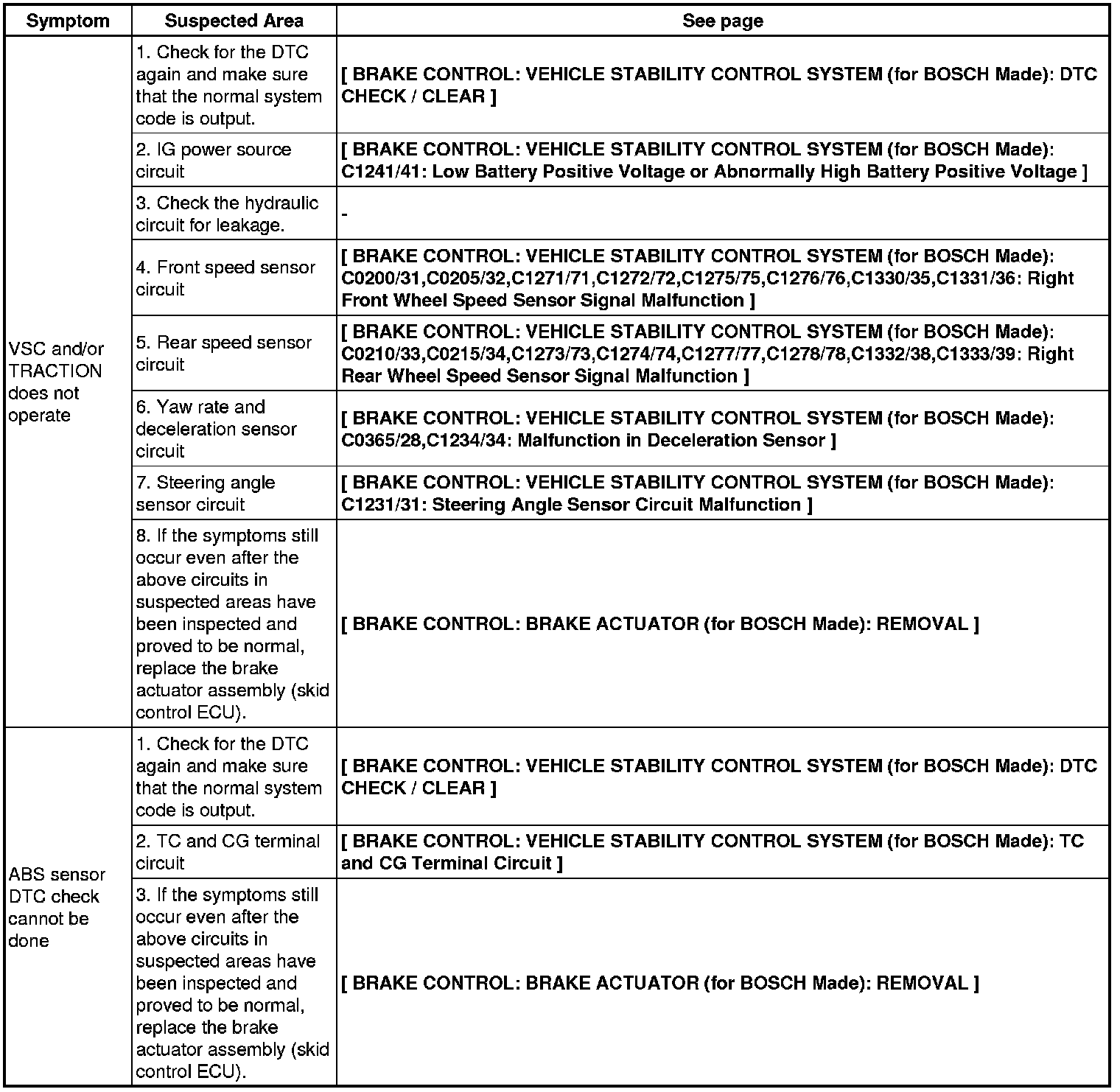 BRAKE CONTROL: VEHICLE STABILITY CONTROL SYSTEM (for BOSCH Made): PROBLEM SYMPTOMS TABLE