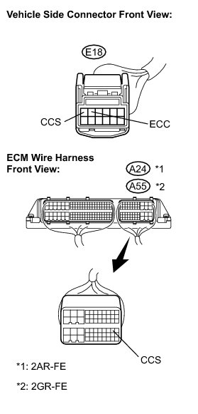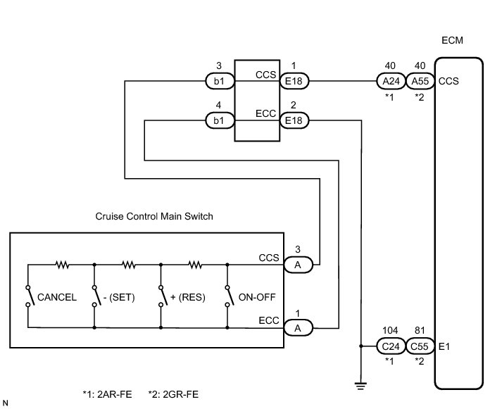 The cruise control main switch operates 7 functions: SET, - (COAST), TAP-DOWN, RES (RESUME), + (ACCEL), TAP-UP, and CANCEL. The SET, TAP-DOWN, and - (COAST) functions, and the RES (RESUME), TAP-UP, and + (ACCEL) functions are operated with the same switch. The cruise control main switch is an automatic return type switch which turns on only while operating it in the direction of each arrow and turns off after releasing it. The internal contact point of the cruise control main switch is turned on with the switch operation. Then the ECM reads the voltage value that has been changed by the switch operation to control SET, - (COAST), RES (RESUME), + (ACCEL), and CANCEL.