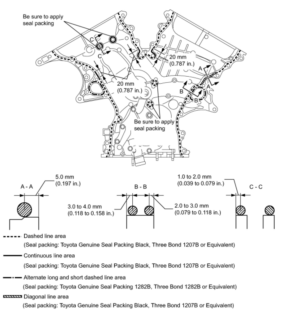 (b) Apply seal packing in a continuous line to the timing chain cover as shown in the following illustration.