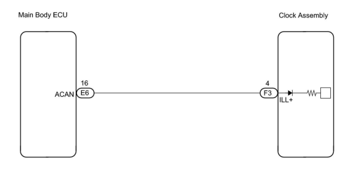 The clock assembly uses this circuit to communicate with the main body ECU via the direct line. The main body ECU uses this circuit to send an auto dimmer signal to the clock assembly. The main body ECU detects the position of the light control switch according to the resistance. When the light control switch is set to the HEAD/TAIL position, the resistance between the HEAD/TAIL terminal and body ground is below 1 Ohms. When the light control switch is set to the HEAD/TAIL position, the main body ECU sends an auto dimmer signal to the clock assembly. When the clock assembly receives an auto dimmer signal from the main body ECU, the clock assembly causes the clock display to be dimmed.