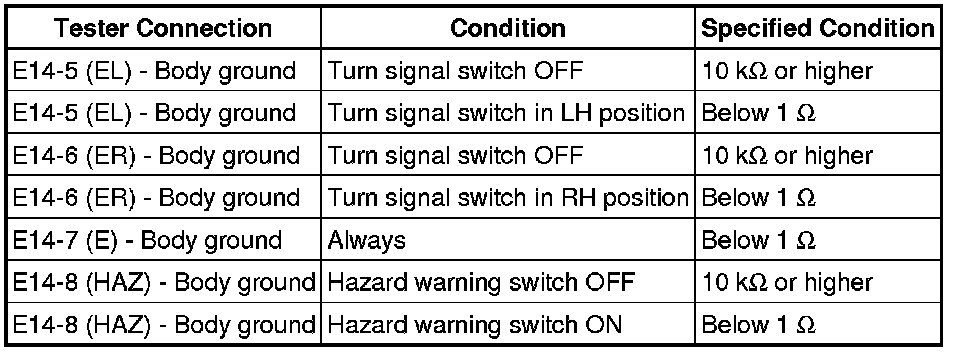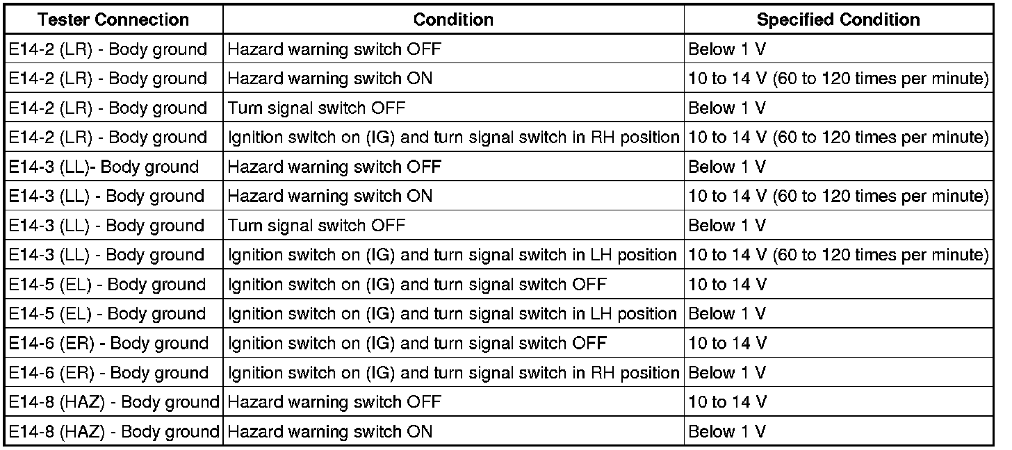(f) If the result is not as specified, replace the turn signal flasher assembly.