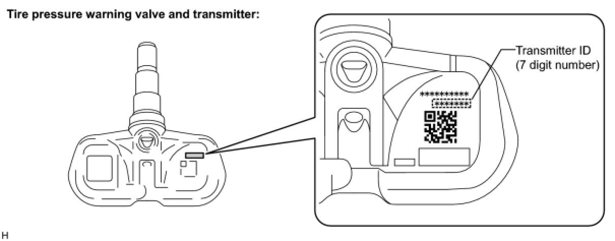 (1) Take a note of the 7 digit number (transmitter ID) written on the new tire pressure warning valve and transmitter when replacing it. Register the transmitter IDs in the tire pressure warning ECU after replacing the tire pressure warning valve and transmitter and installing the tires and wheels on the vehicle.