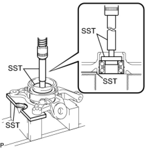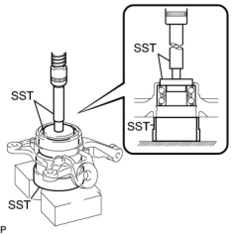 (d) Using SST and a press, remove the front axle hub bearing from the steering knuckle.