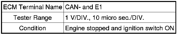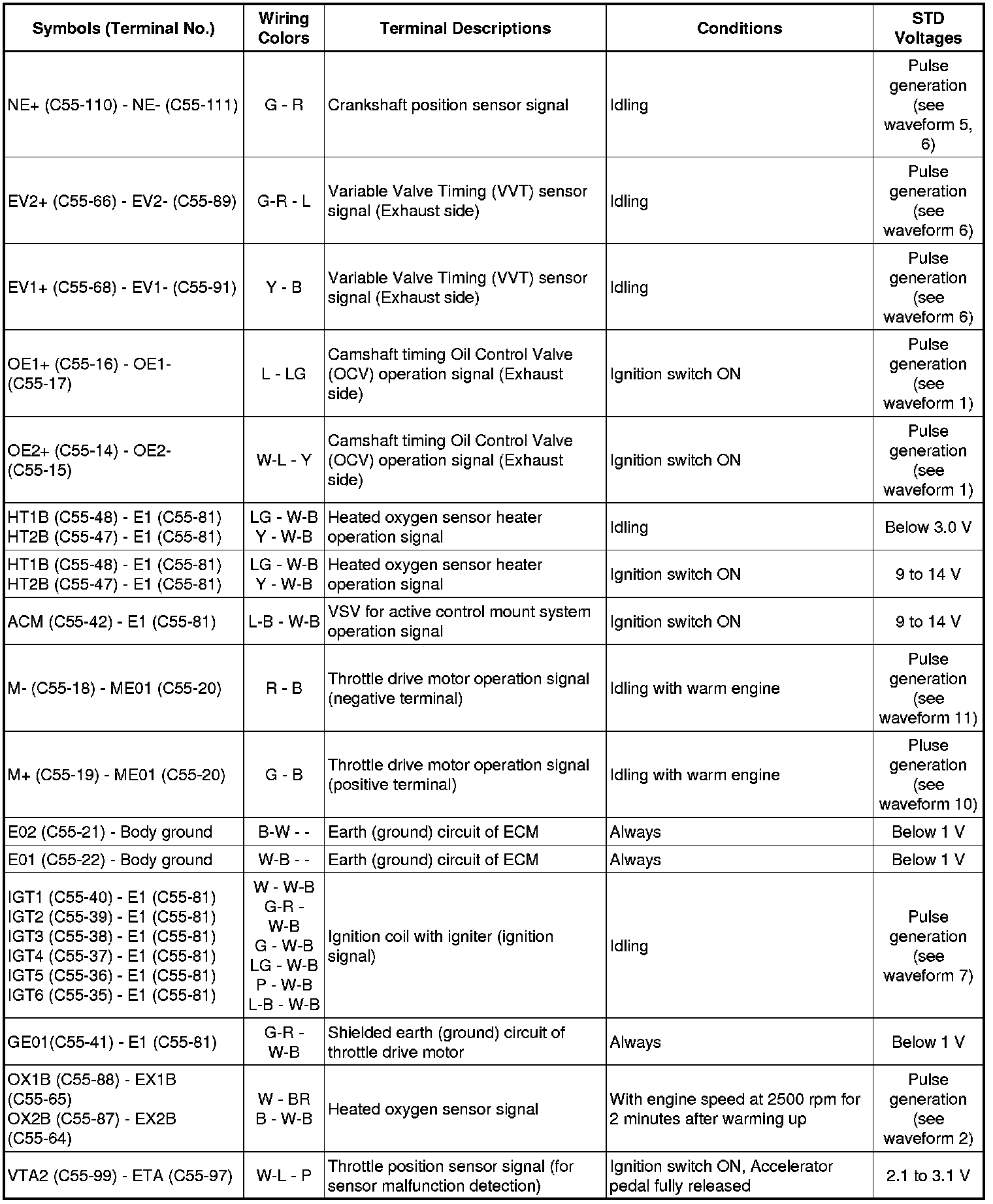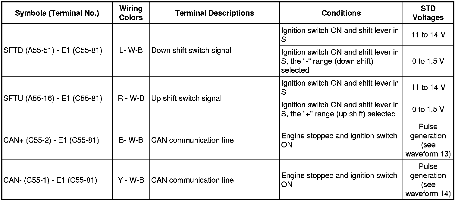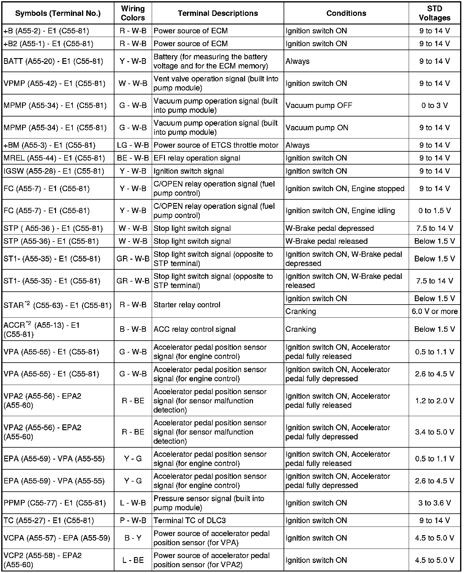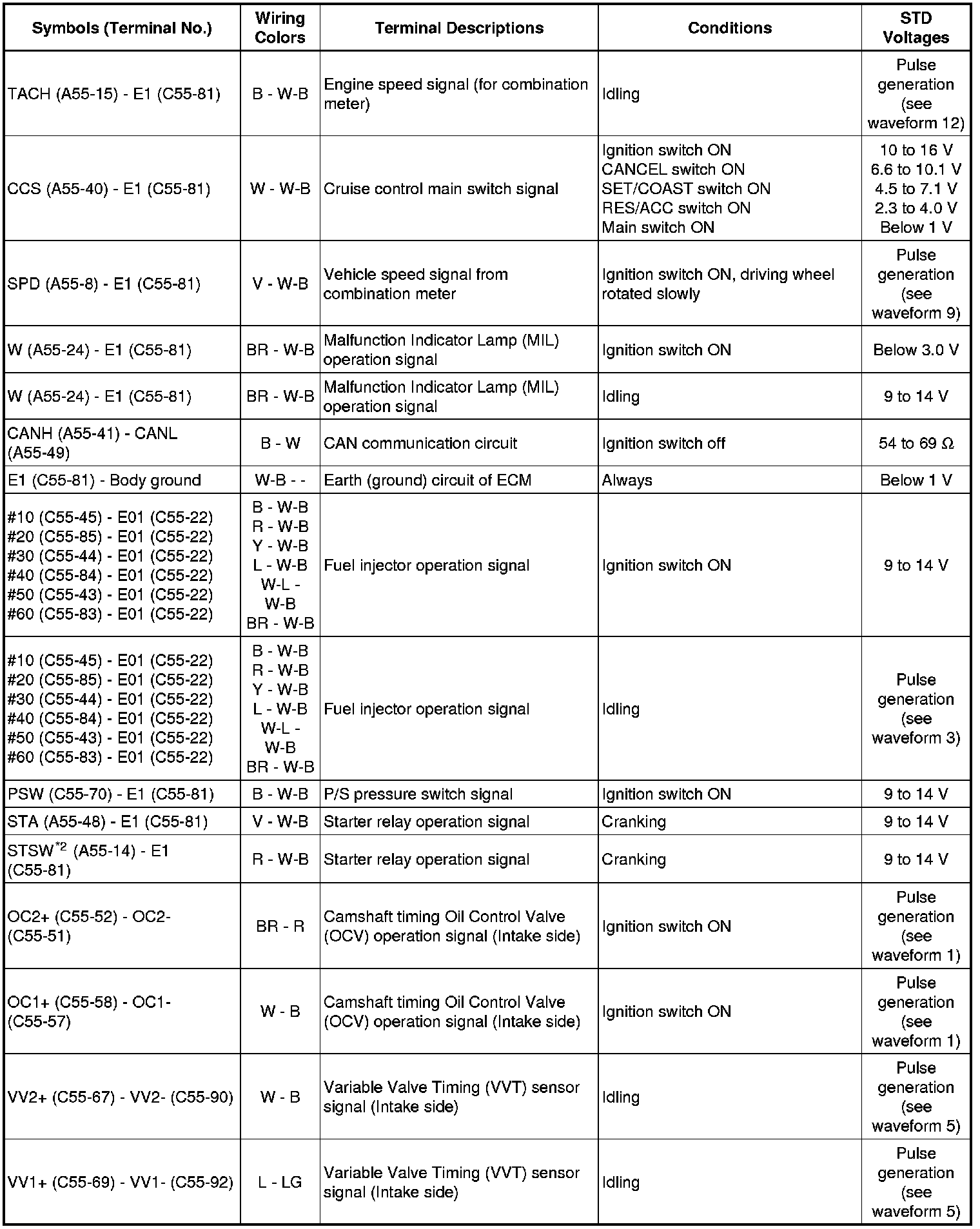 The standard normal voltage between each pair of the ECM terminals is shown in the table below. The appropriate conditions for checking each pair of the terminals are also indicated.
