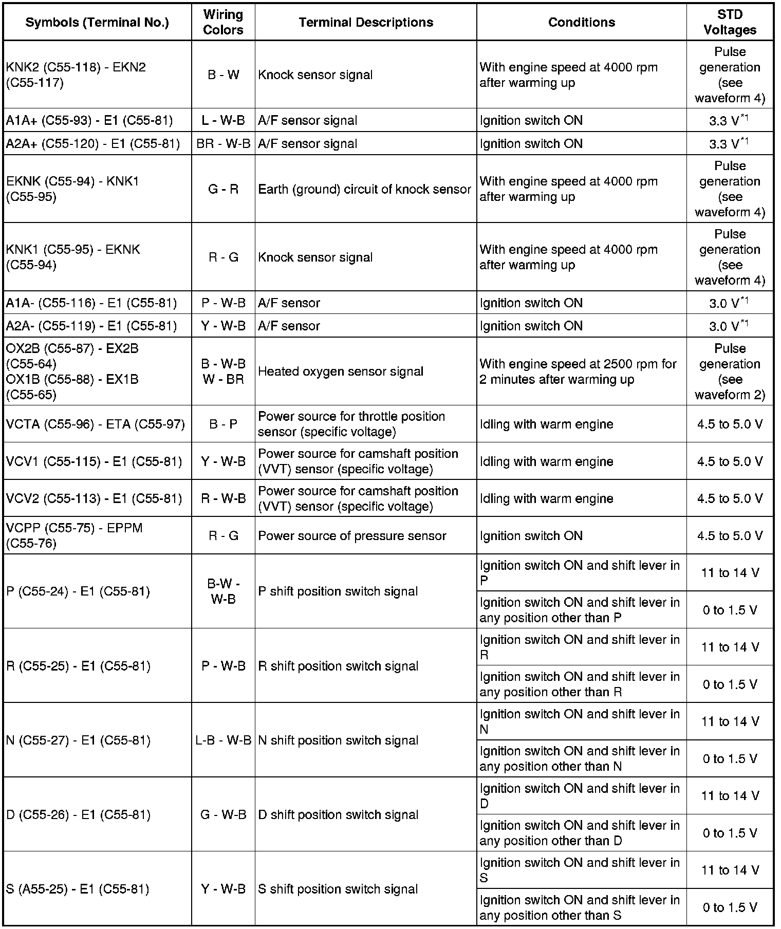 The check results should be compared with the standard normal voltage for that pair of terminals, listed in the "STD Voltages" column.