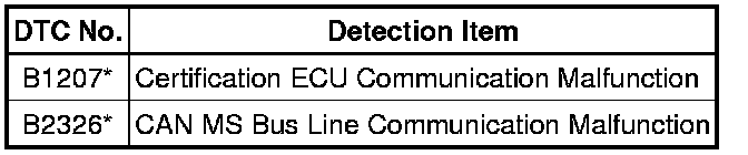 * *: The main body ECU is malfunctioning if B1207 and/or B2326 are output alone. Refer to DTC chart Automatic Transaxle System - U660E.
