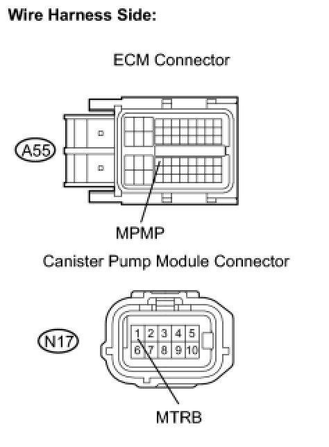 (d) Measure the resistance between the MPMP terminal of the ECM connector and the MTRB terminal of the canister pump module connector.