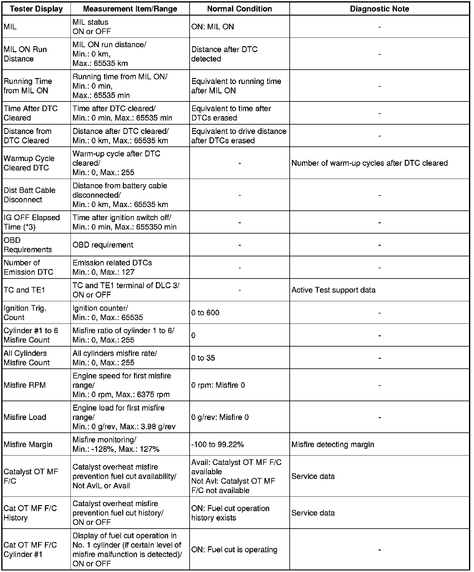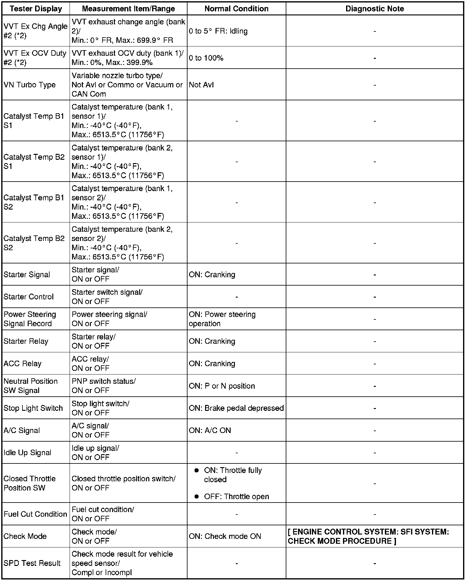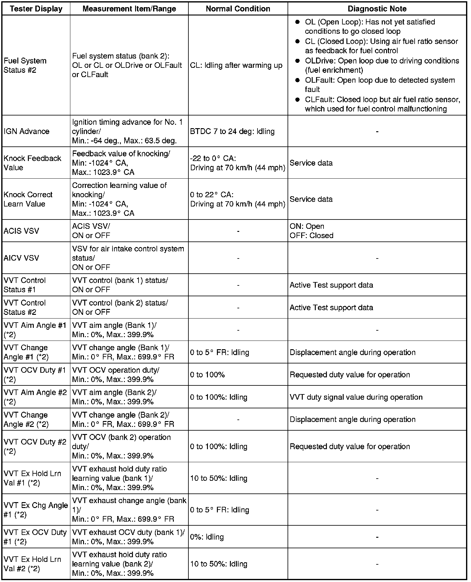 * *2: Data List values are displayed only when performing the following Active Test: Control the VVT Linear (Bank 1 or Bank 2) or Control the VVT Exhaust Linear (Bank 1 or Bank 2). For other Active Test, the Data List value will be 0.