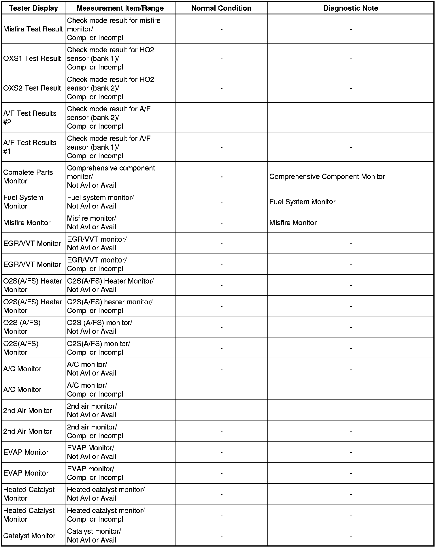 In the table below, the values listed under Normal Condition are reference only. Do not depend solely on these values when determining whether or not a part is faulty.