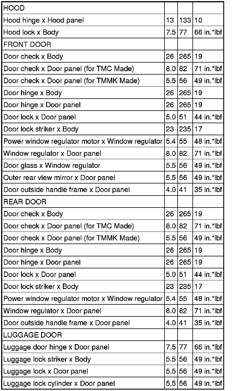 / DOOR: TORQUE SPECIFICATIONS