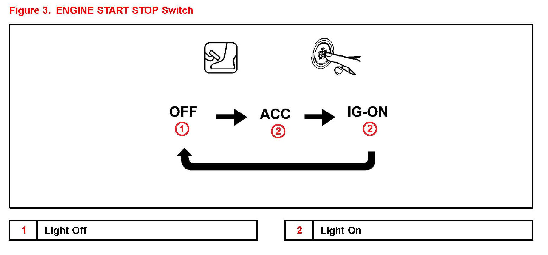 (2) Without depressing the brake pedal, press the "ENGINE START STOP" switch and confirm the mode changes properly.