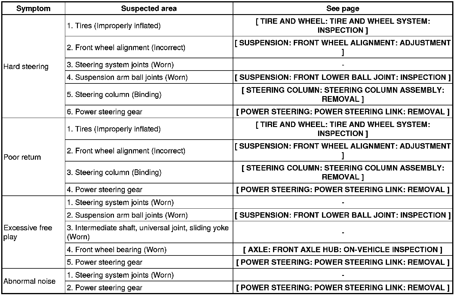 STEERING COLUMN: STEERING SYSTEM: PROBLEM SYMPTOMS TABLE