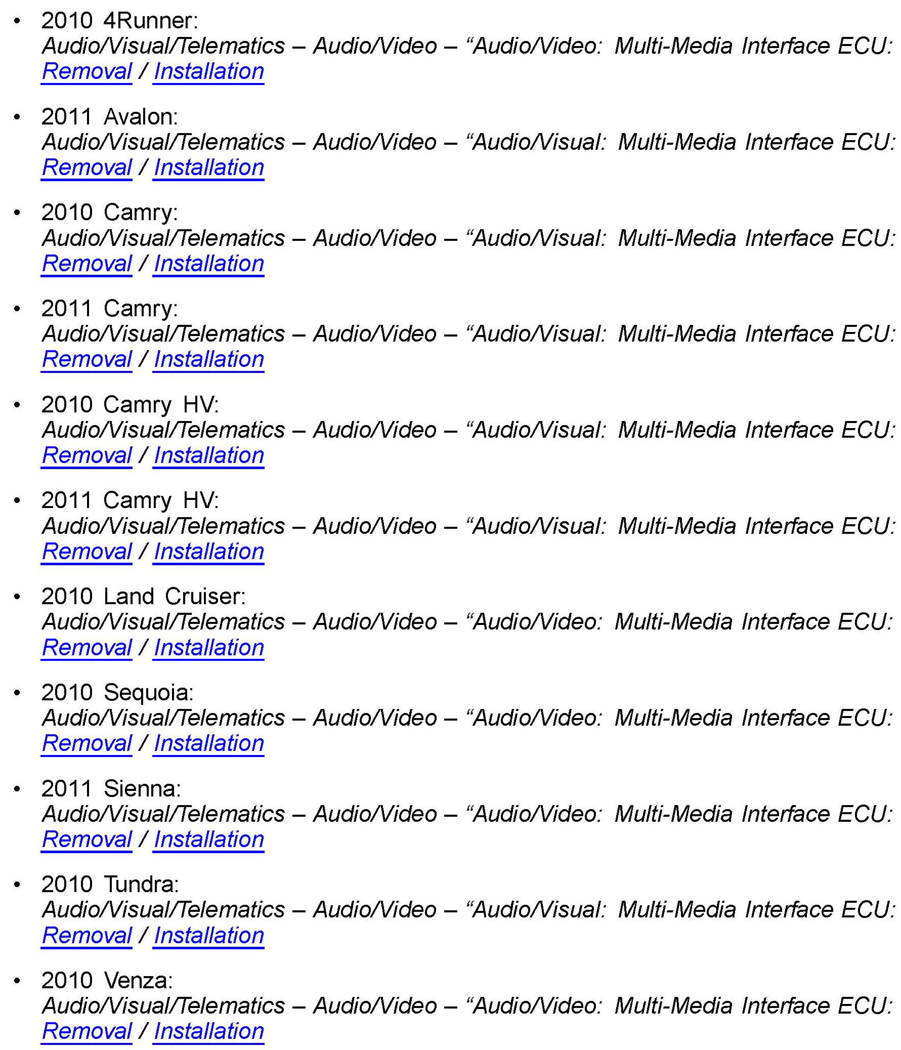 Some 2010 - 2011 Toyota vehicles may exhibit intermittent operation of USB/iPod(TM) devices while in use. A newly designed Multi-Media Interface ECU has been developed to correct this condition.
