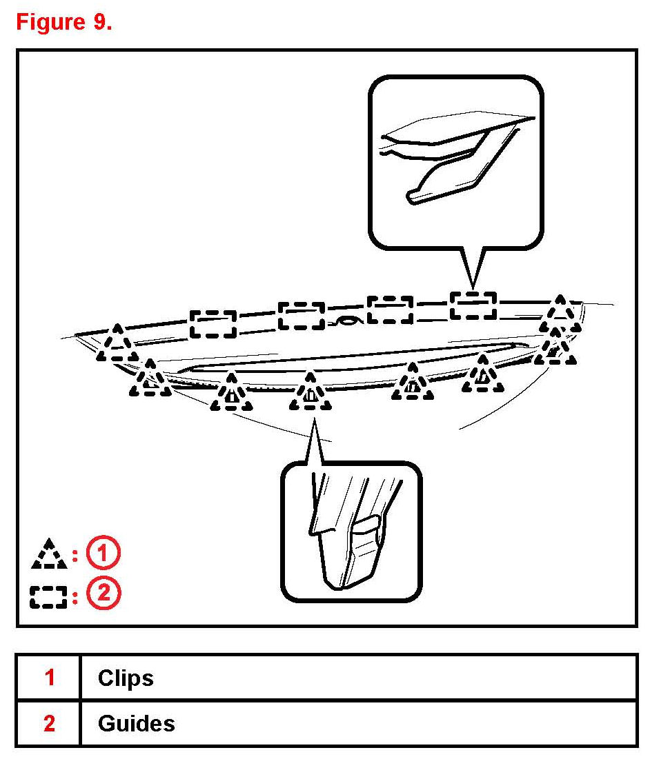 C. Engage the 8 clips and install the No. 1 defroster nozzle garnish.