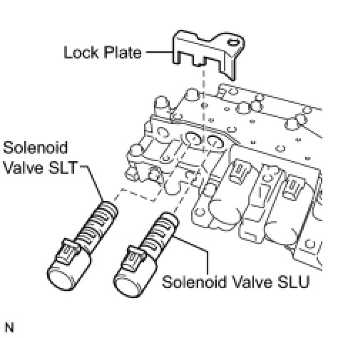 (b) Install the shift solenoid valve SLT and lock plate to the valve body assembly.