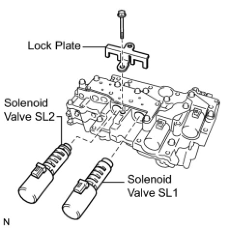 (b) Install the shift solenoid valve SL2 and lock plate to the valve body assembly with the bolt.