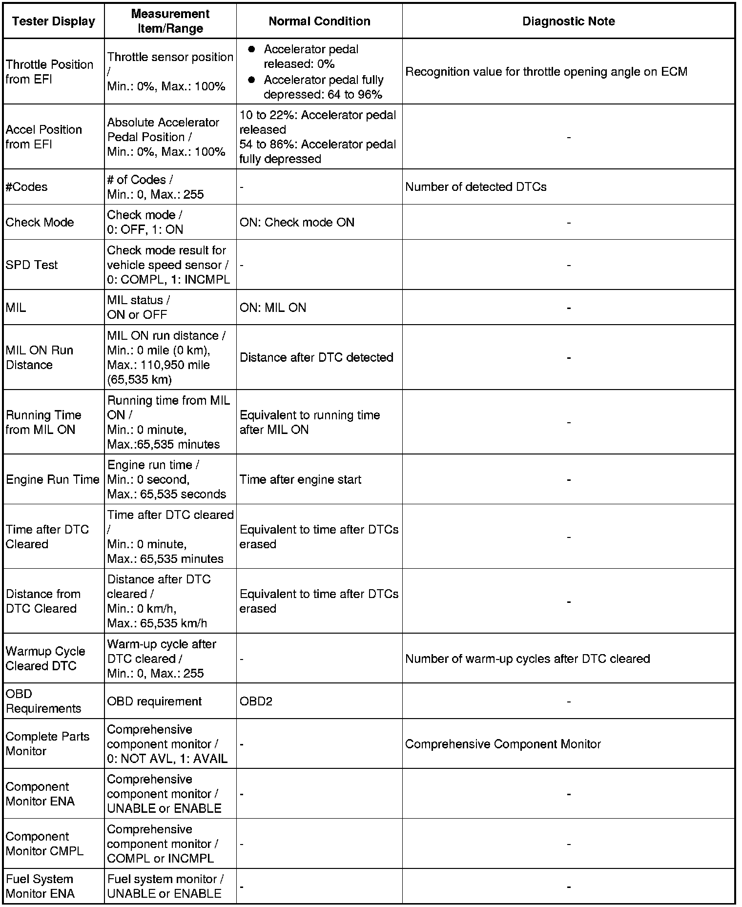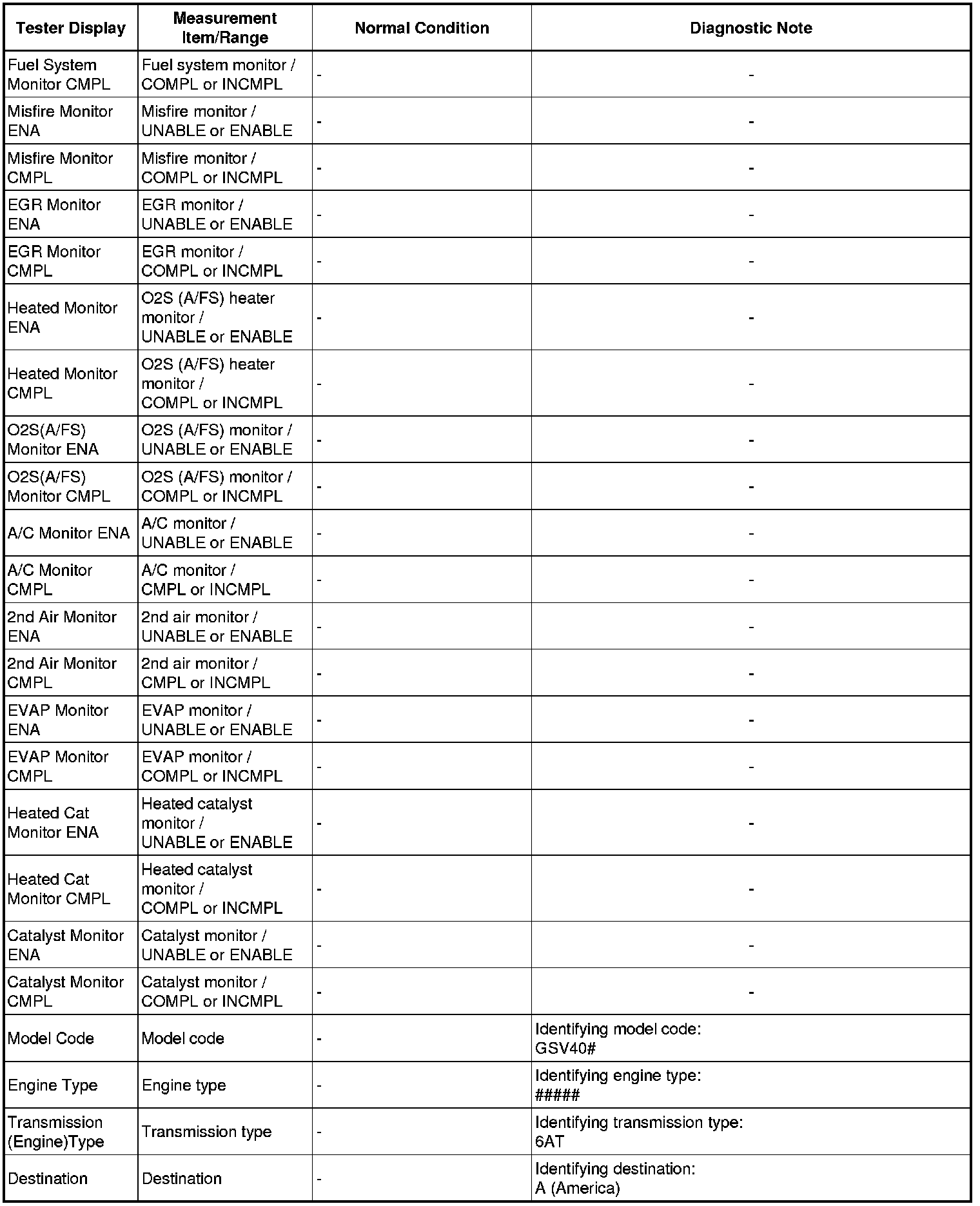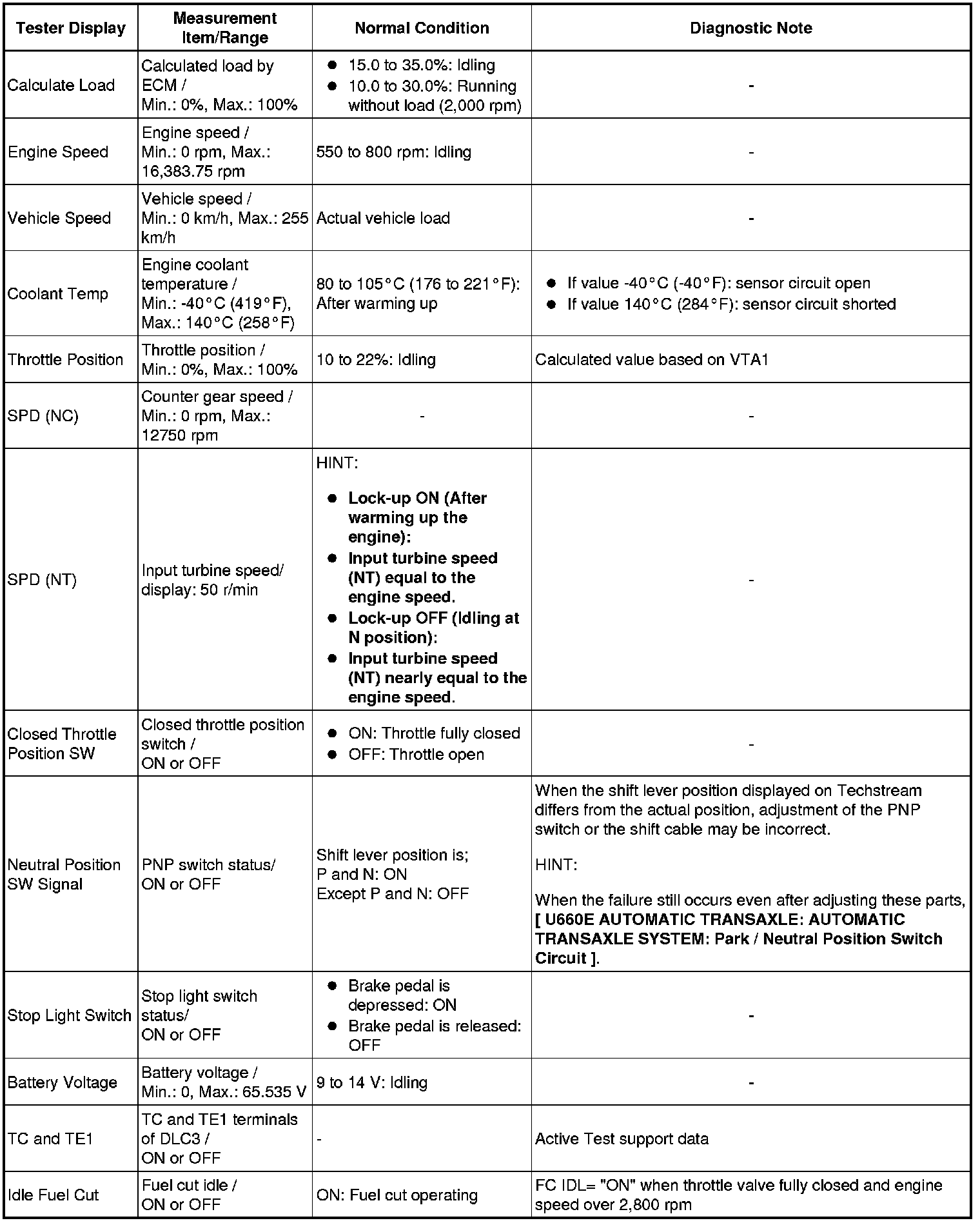 Using Techstream to read the Data List allows the values or states of switches, sensors, actuators and other items to be read without removing any parts. This non-intrusive inspection can be very useful because intermittent conditions or signals may be discovered before parts or wiring is disturbed. Reading the Data List information early in troubleshooting is one way to save diagnostic time.