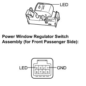 (1) Apply battery voltage to the power window regulator switch assembly and check that the LED illuminates.